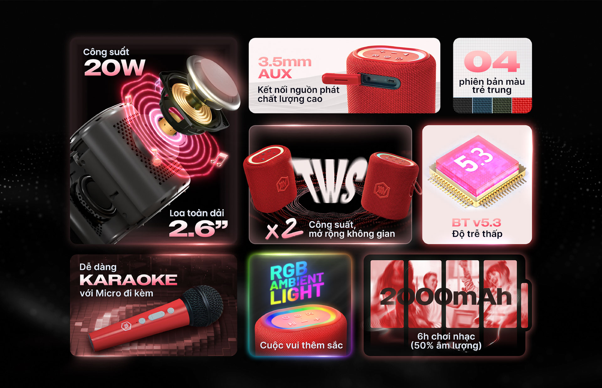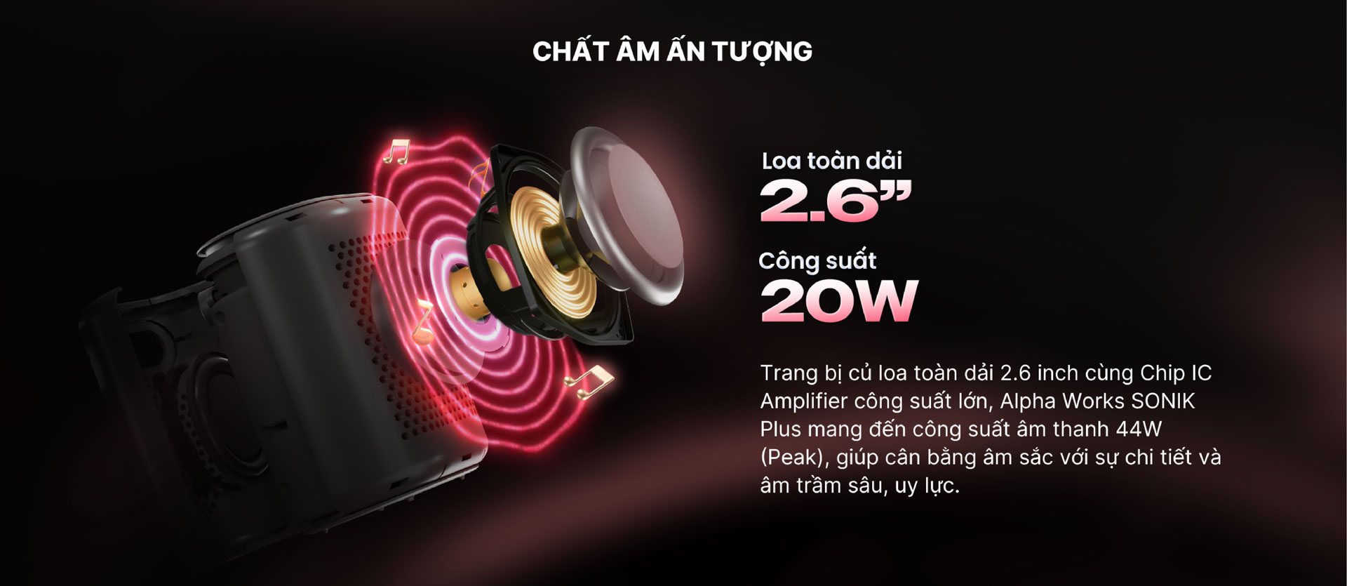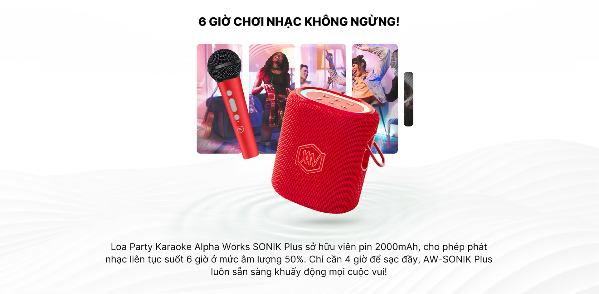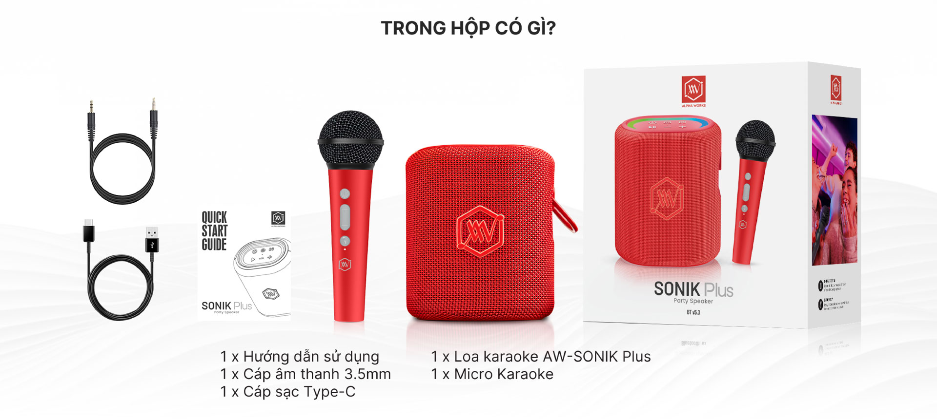 Alpha Works SONIK Plus (AW-SONIK+) – chiếc loa di động kết hợp micro không dây, mang đến âm thanh nội lực và khả năng karaoke cực kỳ dễ dàng. Với thiết kế nhỏ gọn, công nghệ hiện đại và thời gian sử dụng dài, AW-SONIK+ sẽ là người bạn đồng hành tuyệt vời cho mọi cuộc vui, từ các buổi tiệc, lớp học đến những chuyến dã ngoại đầy thú vị.